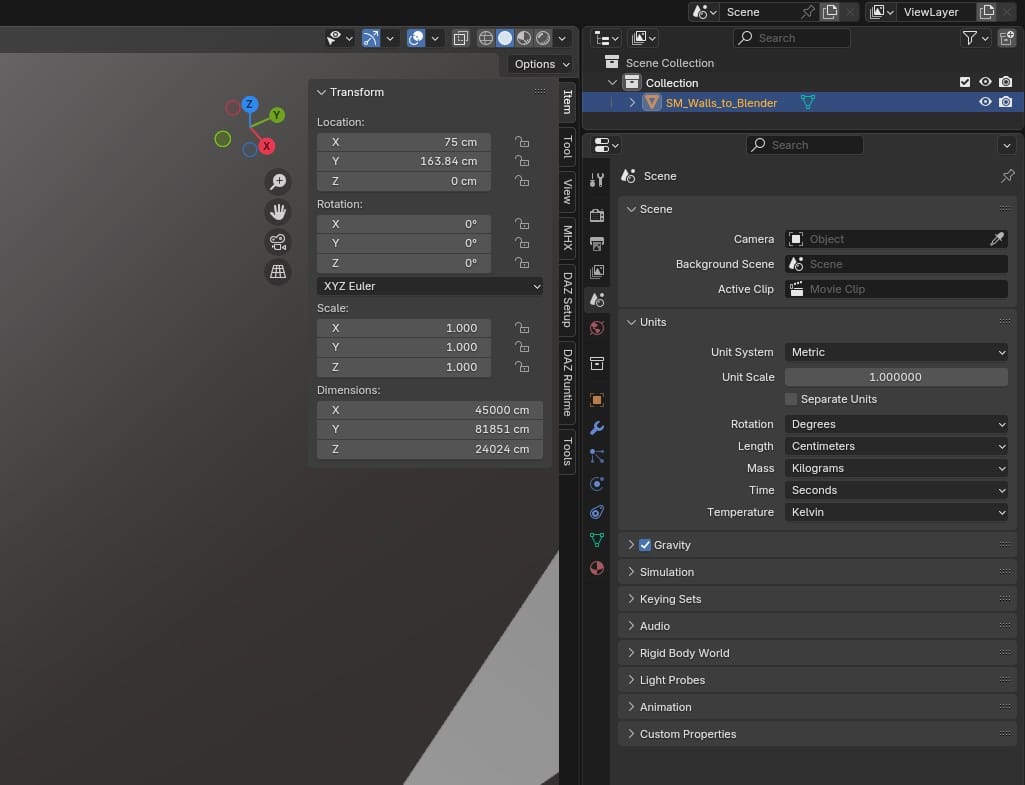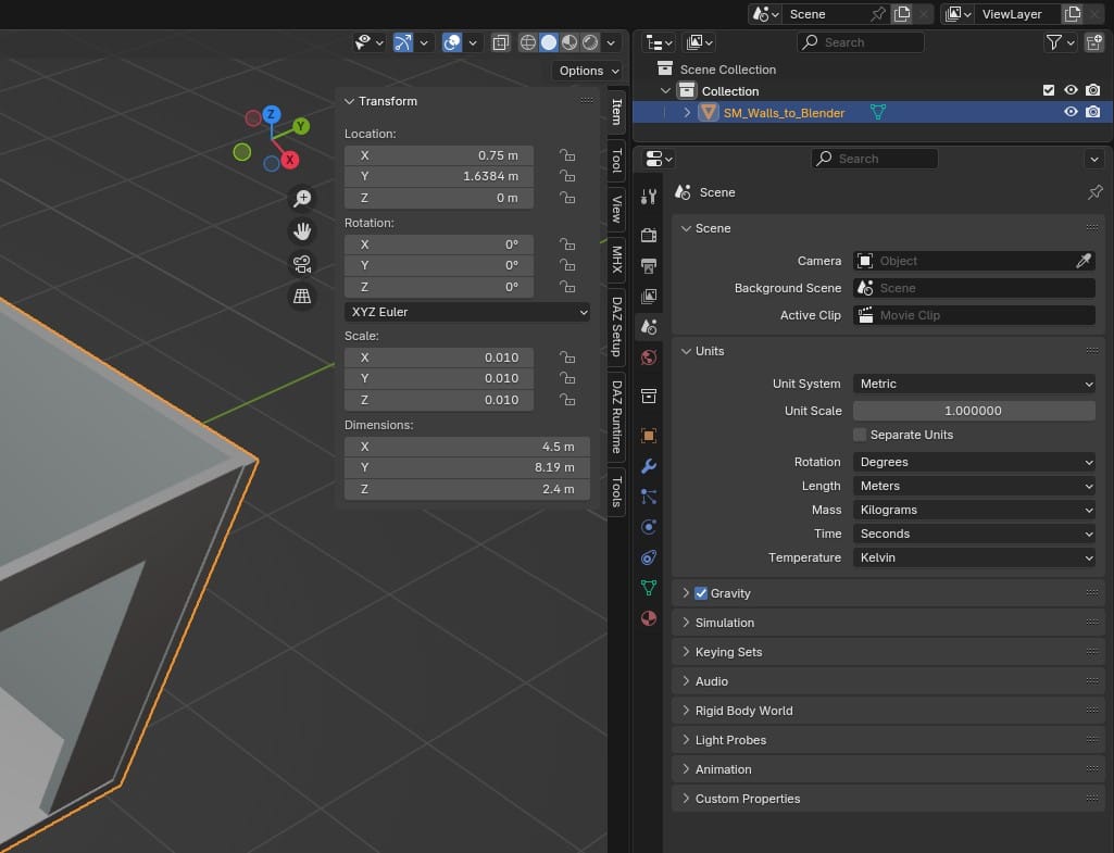 I already had a bare bones apartment built in UE, but I wanted to redo everything in Blender. To use as a reference, I decided to export the apartment walls from Unreal. A strange thing I noticed, after importing the walls in Blender, was their scale. They were automatically scaled down by a factor of 0.01. But, for some reason, their dimensions matched the dimensions in Unreal Engine. In UE, the walls were 240cm tall, and Blender had them at 2.4m. Why was Blender showing that as being 0.01 scale?