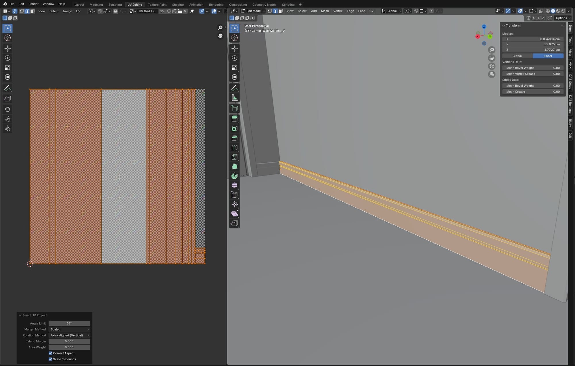 This meant the more square-shaped pieces would get a larger piece of the UV space than the long pieces. They would appear higher resolution. Since all the pieces of molding would be getting the same texture applied, I needed every piece to have the same texture resolution, regardless of its size or shape. Fortunately, Blender lets you select multiple objects and open them simultaneously in Edit mode, where you can select all faces and unwrap them into a single, shared UV space, preserving their relative size/proportion.