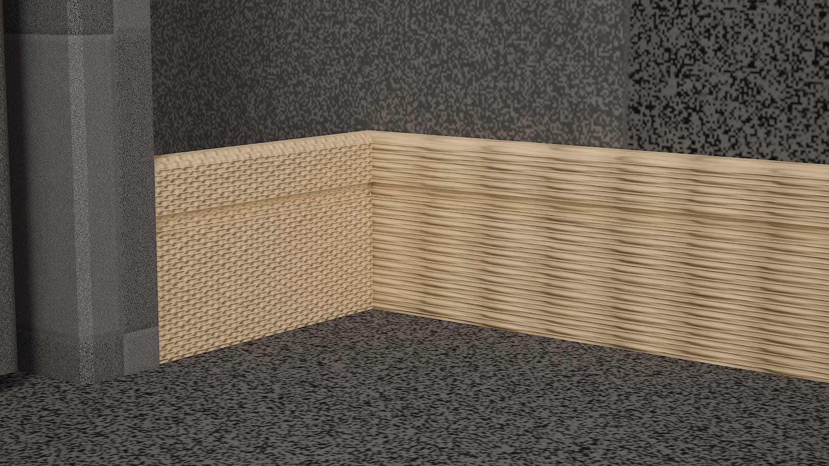 What I hadn't considered is that this makes no sense for long, thin objects, like this piece of molding along the floor. Forcing the long faces of an object like this to fill a square UV map will stretch the texture. I didn't notice this until I sent the floor molding pieces over to Unreal Engine and put a test texture on them: