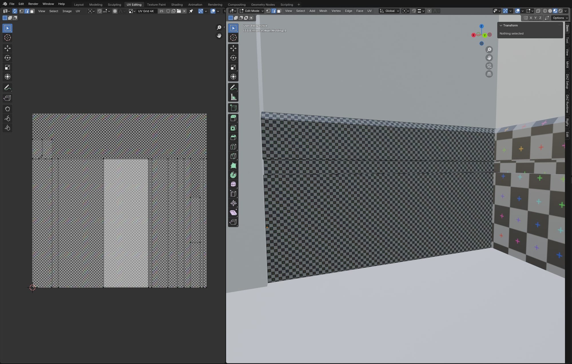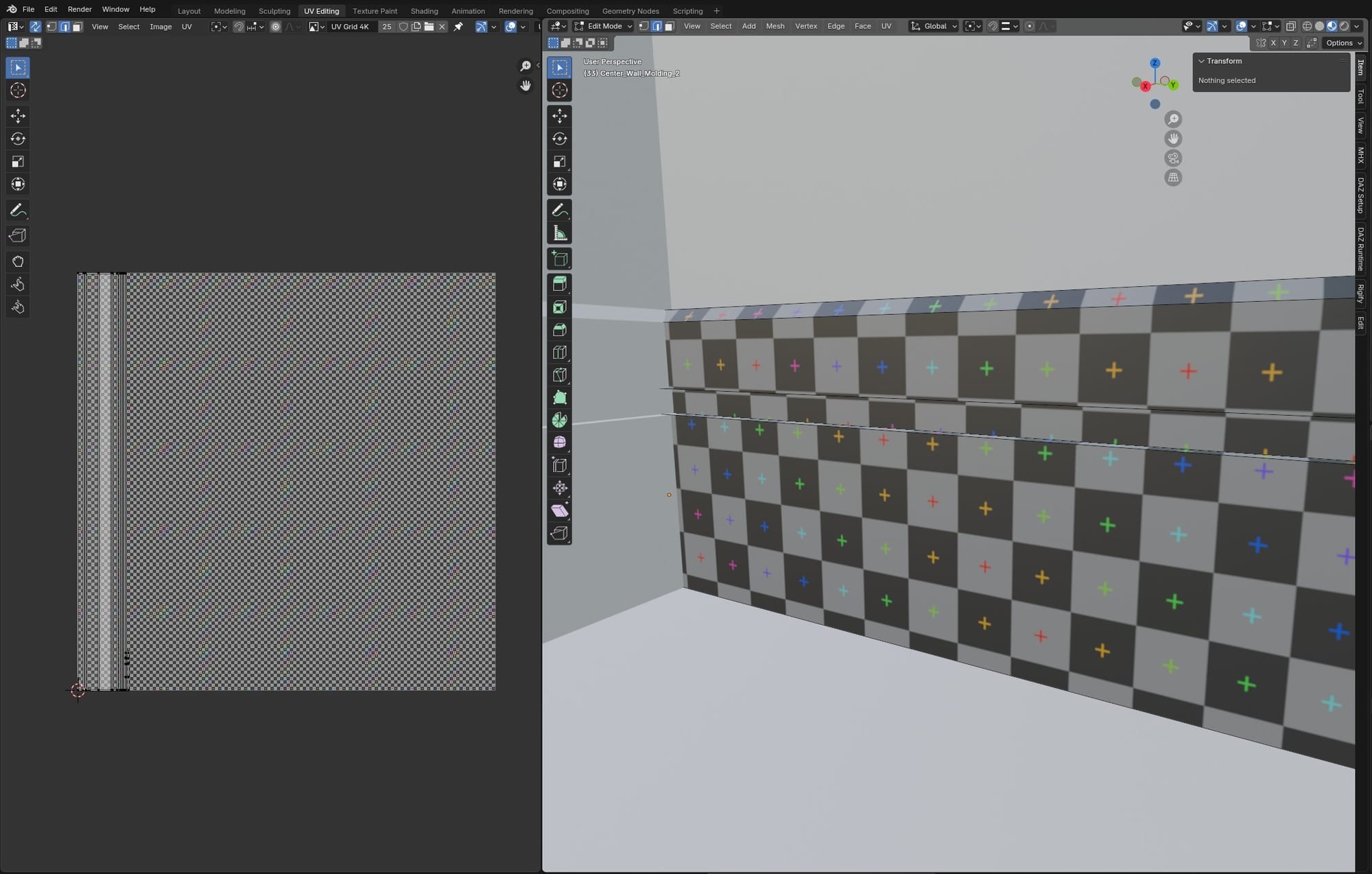 Back in Blender to troubleshoot, I added a UV grid image texture to the molding's material. This made it easy to see the stretched UVs on the long piece: