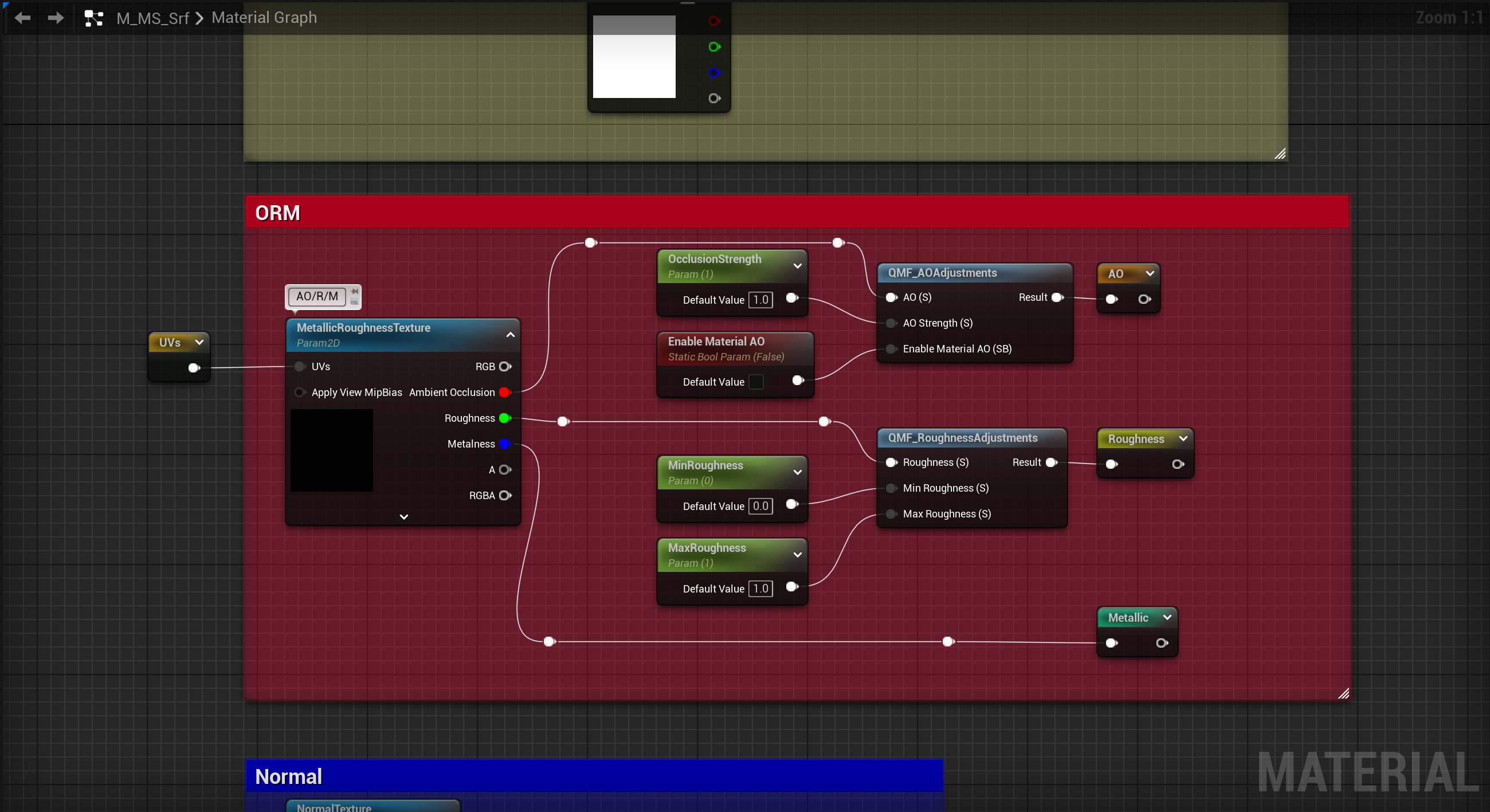 I decided the most versatile setup would be to duplicate the M_MS_Srf and, in a custom version, split the ORM texture sample into three nodes: