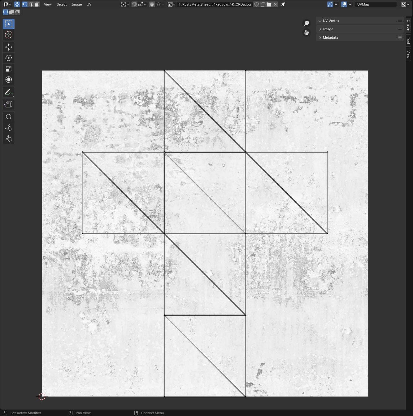 Ok, so we see how a vertex's UV coordinates translate into a pixel on a texture map, but what about all the pixels between the vertices? At render time, the engine interpolates between the vertices. In the above screenshots, Blender is displaying the cube mesh in quads, but render engines work in triangles, so from the perspective of the renderer, the cube looks more like this...