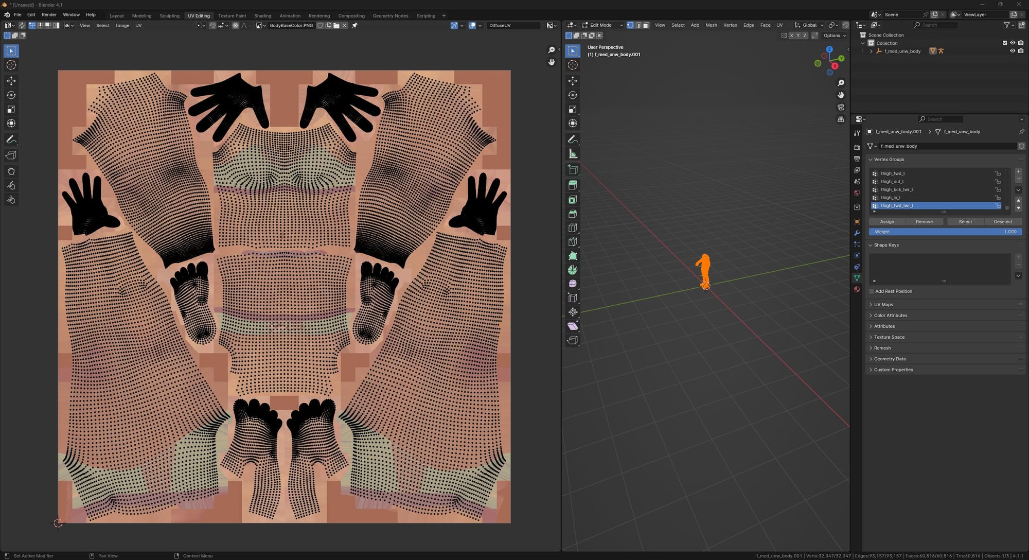 Also, texture coordinates are included in formats like FBX. Here is the MetaHuman body mesh, exported from Unreal Engine and imported into Blender and viewed in the UV Editor, with the body texture map behind it.