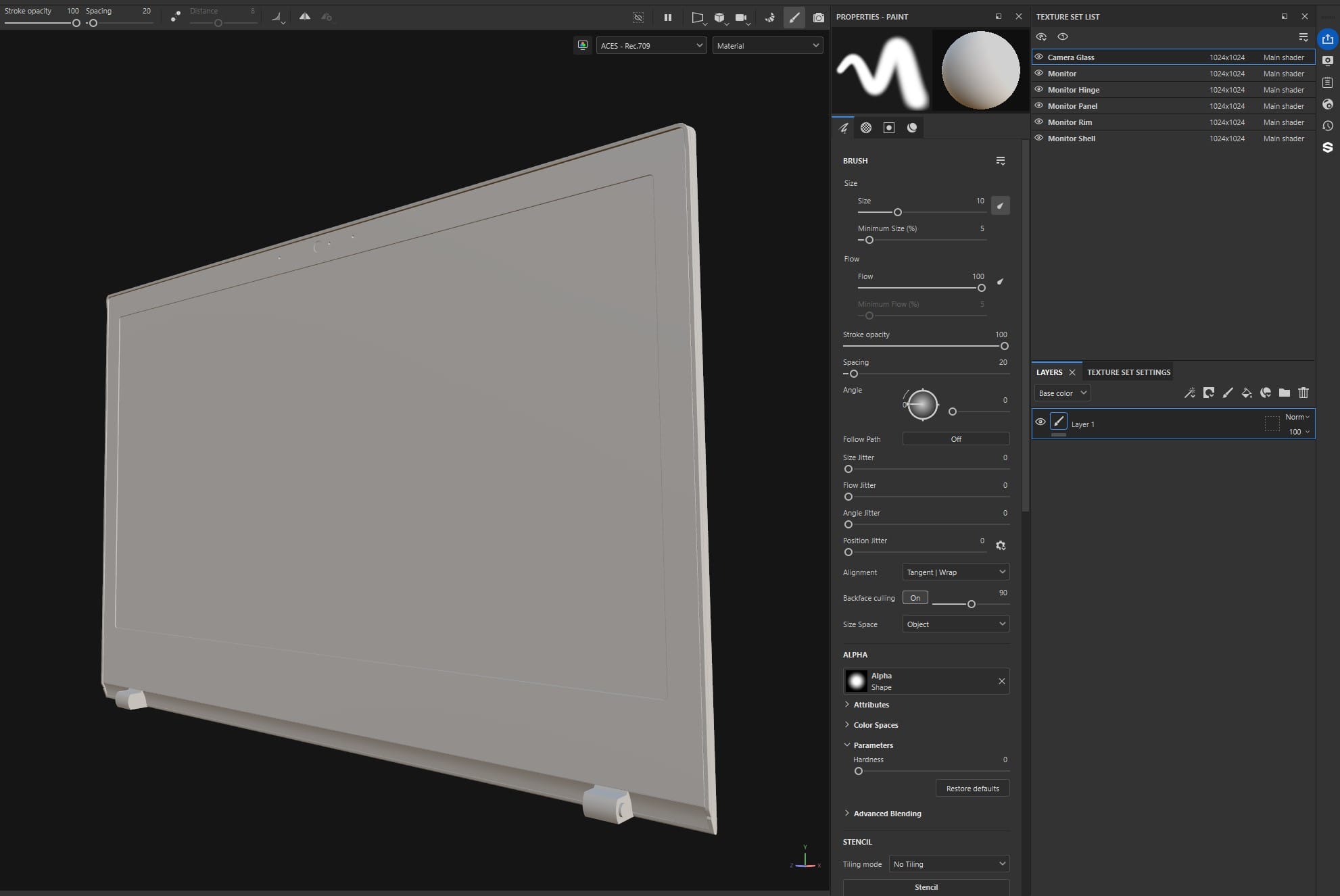 My decision was to create a separate material for every visually distinct portion of the mesh. This meant that some small parts of the mesh (like the monitor hinges) got their own material, and I ended up with a lot of materials (19 total). I felt this was simpler. Another strategy would have been to assign multiple mesh components the same material and then use Geometry Masks in Substance to isolate them when applying color and detail. The geometry masks in SP were defined by the mesh objects from my Blender project.