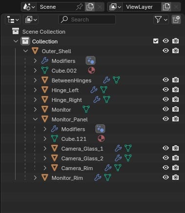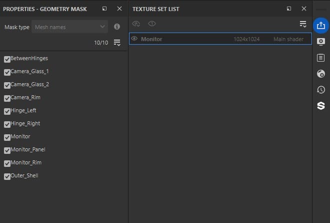 If I had given them all one material in Blender, say I called it "Monitor," this would have meant that the rough matte plastic of the monitor shell, the shiny plastic of the monitor itself, and the off-white metal of the hinges all share the same color map, roughness map, metallic map, etc. Without geometry masks, detailing the individual components would be difficult. A fill layer added to give the monitor a black surface would color the hinges as well. But, since each of these components is a separate object in the Blender project, and that data transfers to Substance Painter through the FBX, I could use those object names to mask the components and apply certain layers only to the appropriate mesh.