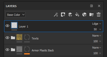 Notice how when they change from Base Color to Roughness, the blend mode on the top layer changes from "Ldge" to "Norm," and the opacity setting changes from 50 to 100.