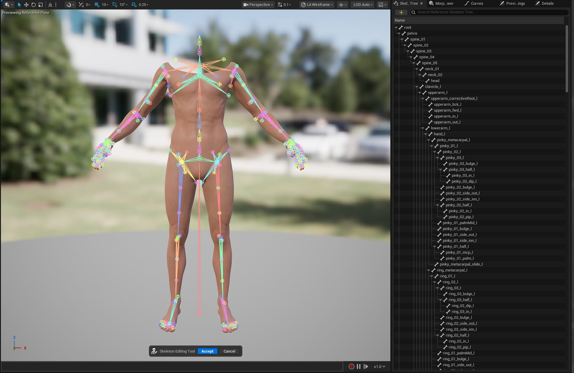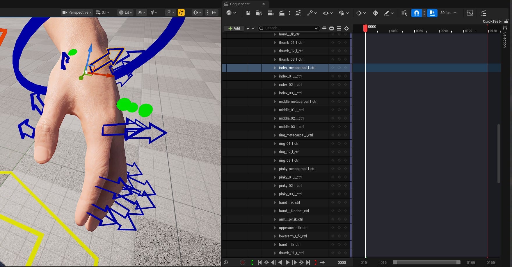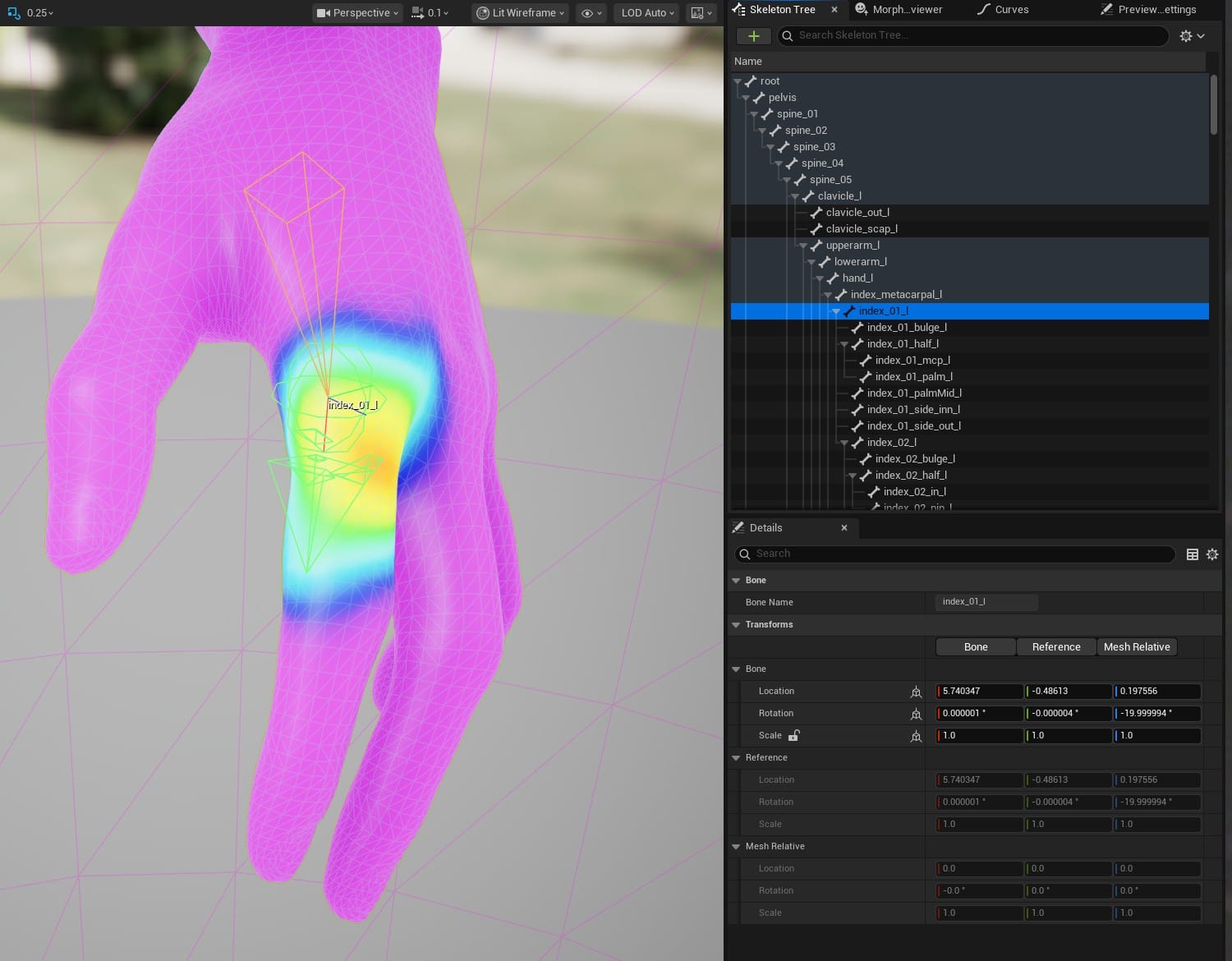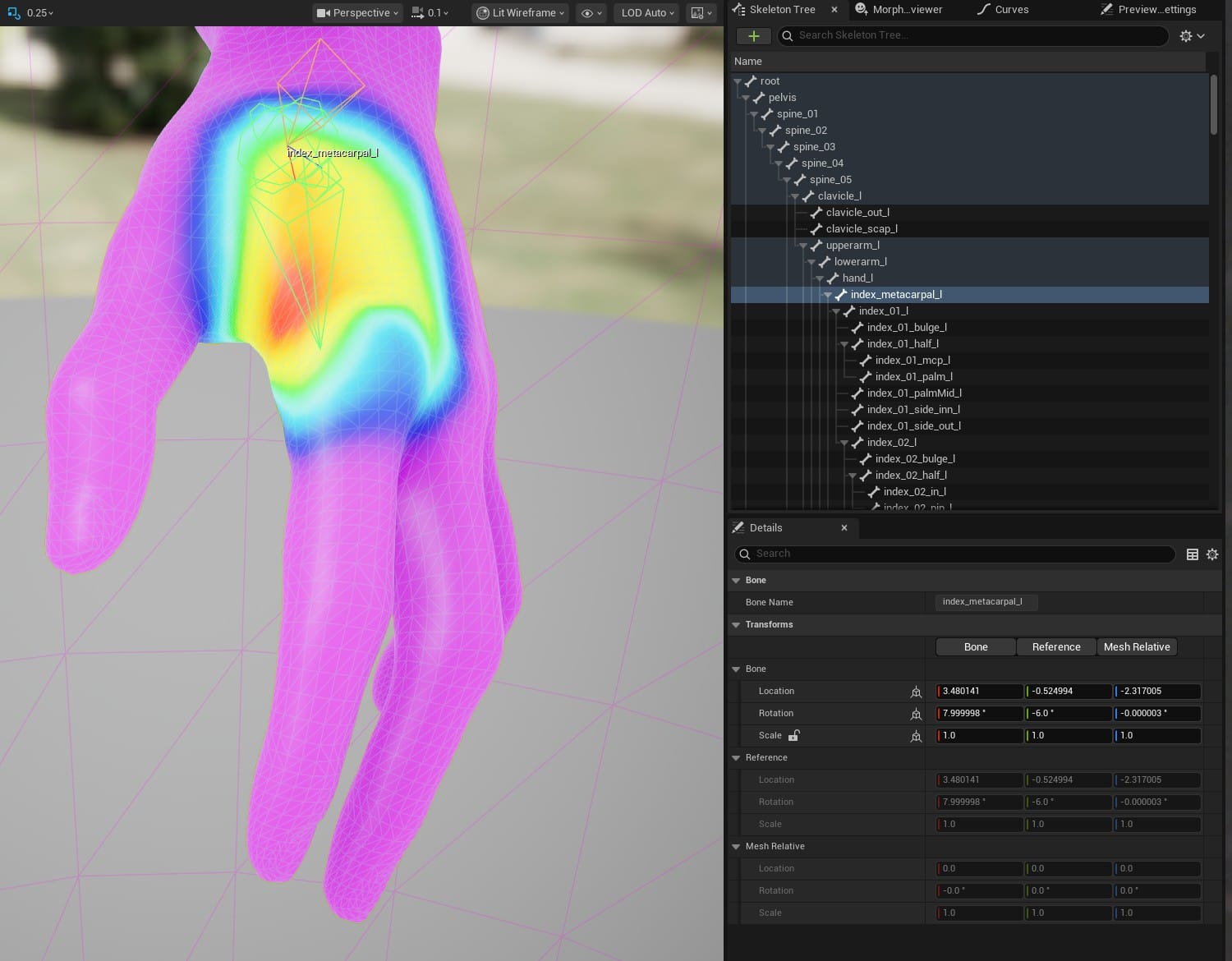 Rigging is a deep subject, and building a rig for a complex character requires technical skill and artistry. For example, the MetaHuman body skeleton has 342 bones. In these screenshots I have selected two bones in the left hand, "index_metacarpal" and "index_01." The bones are invisible objects, existing only to drive the movement of certain vertices.