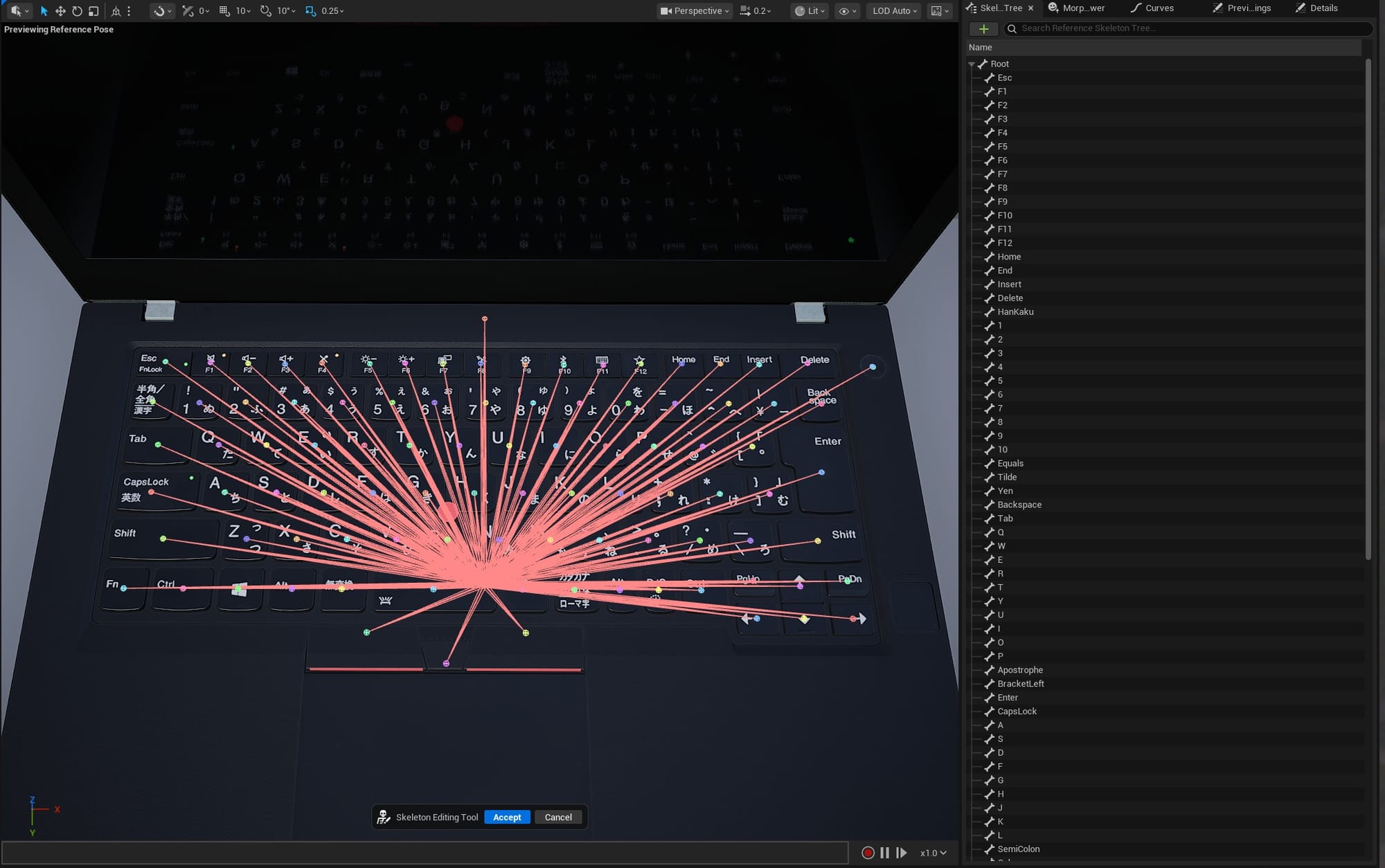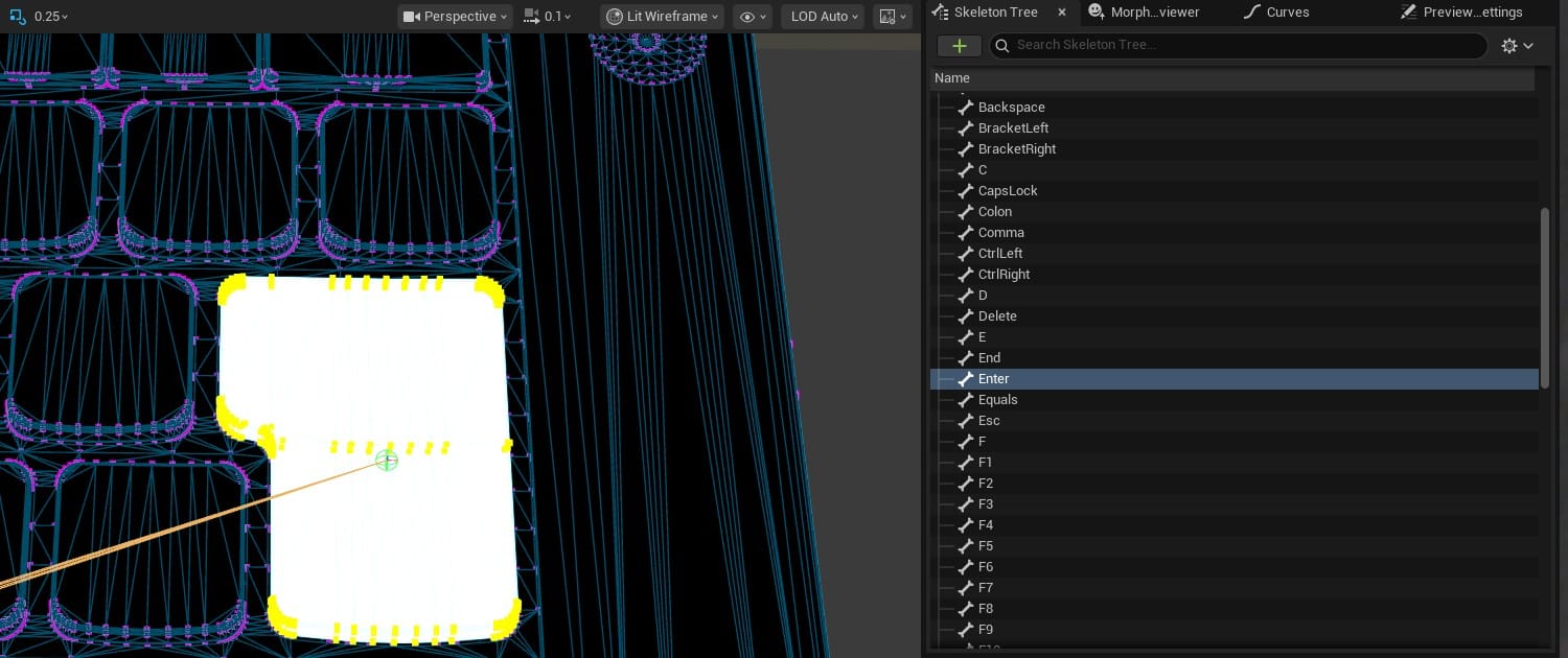 In a humanoid character, the skeleton has a hierarchy, with certain bones influencing the movement of others. For this computer rig, all the bones move independently, so building the skeleton was easy. All bones connect to the root bone, and nothing else. There are many guides, like this one, for creating a skeleton with the Skeletal Mesh Editor in UE.