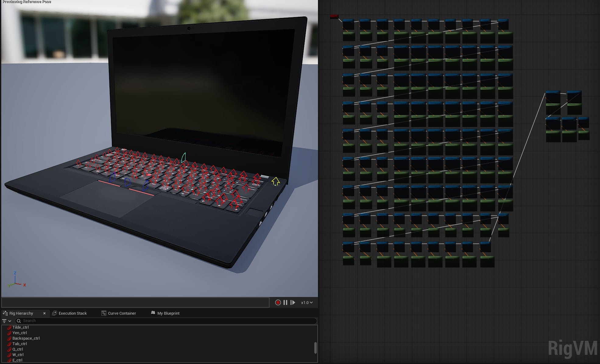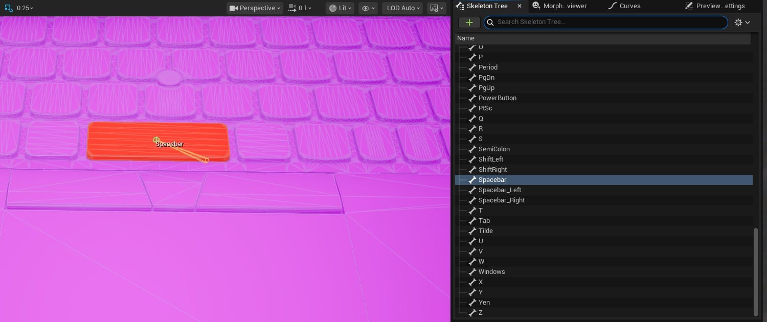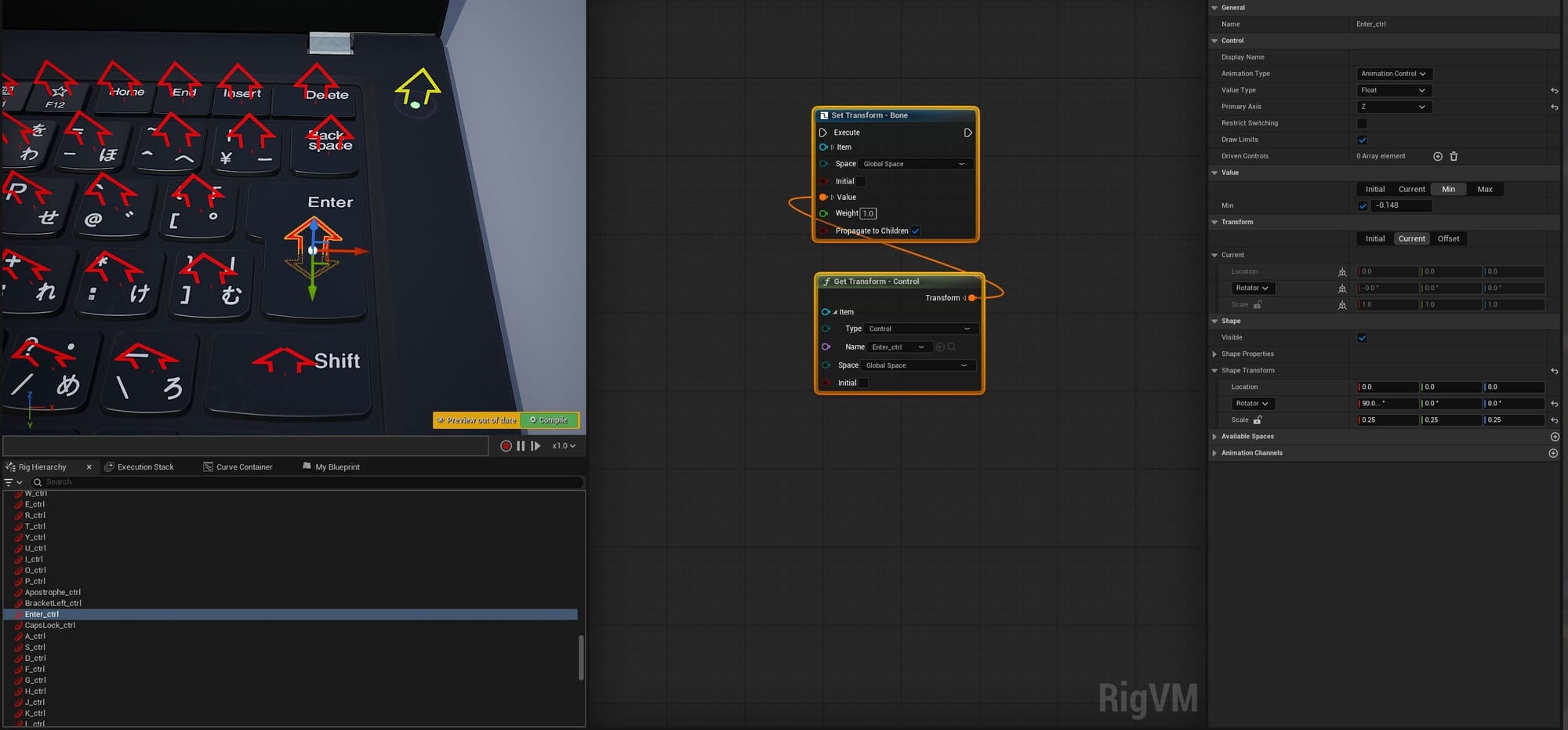 The documentation for the standard node-based control rig made a lot more sense to me, and the Quick-Start Guide was plenty. With a simple pair of nodes for each bone, I had all the controls I needed. In the details panel I could change their shape and color, and set limits on their movement. For example, I set each key bone to only move on the Z axis between 0 and -0.148, a simple down-up key press motion.